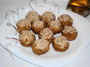 Скатать шарики, одной стороной обмакнуть в кунжут. Разложить это чудо по бумажным капсулам (если нет капсул, то выложить на смазанный противень)