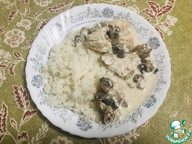 Порезанные мясо, спаржу, грибы, а также горошек аккуратно примешать к соусу, все это дело разогреть. Подавать с рисом. Ну или с любым гарниром, который Вам больше по душе!