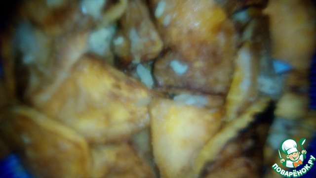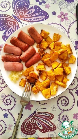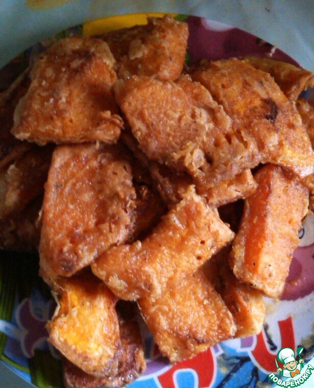 Перед тем, как начать готовить, сок из тыквы слить. Каждый кусочек запанировать в муке.