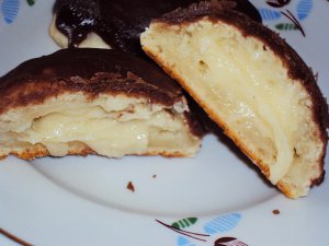 Выпекать при температуре 180 градусов 15 минут. Коржики должны быть беленькими. Не перепекайте их, а то начинка вся вытечет. Можно кушать так или покрыть шоколадной глазурью. |