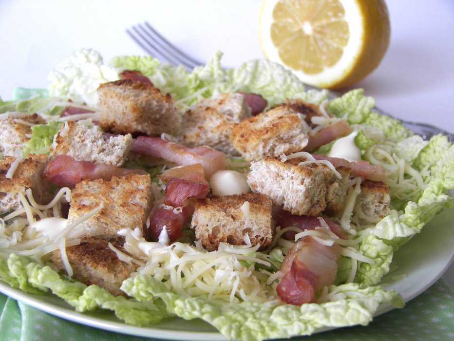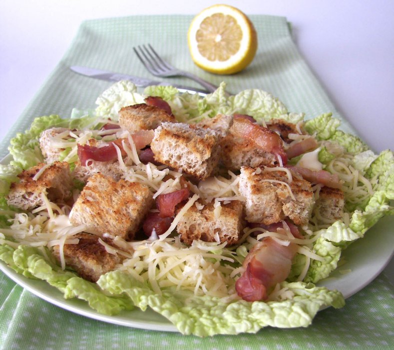 Ароматные сухарики, хрустящий бекон, сочная пекинская капуста. И интересный соус. Этот салат – прекрасная альтернатива популярному и уже приевшемуся "Цезарю"! Этот рецепт был размещен пользователем ЮРИСТИК в 2008 году под названием "Царица" и иллюстрирован мною в рамках акции "Раскраски".