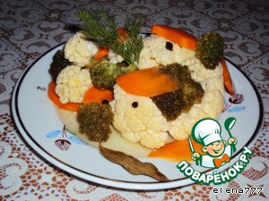 • Цветную капусту и брокколи разделить на соцветия, морковь нарезать колечками (если крупная, то полукольцами), чеснок нарезать тонкими пластиночками, перемешать, уложить в банку или стеклянную кастрюлю, залить горячим маринадом.