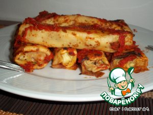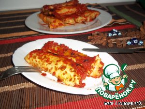 1/3 соуса кладем на дно формы, сверху - блинчики. Поливаем оставшимся соусом и в духовку на 25-30 минут. Периодически проверяйте готовность, а то я свои слегка подпалила сверху, но на вкус не повлияло!