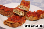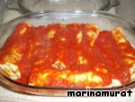 1/3 соуса кладем на дно формы, сверху - блинчики. Поливаем оставшимся соусом и в духовку на 25-30 минут. Периодически проверяйте готовность, а то я свои слегка подпалила сверху, но на вкус не повлияло!
