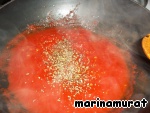 Делаем соус и в тоже время включаем духовку на 200 градусов, чтобы нагрелась. Я вместо 4 помидоров взяла 3 и 3 ст.л. томатной пасты, она придает соусу насыщенный красный цвет и вкуснее, мне так кажется. Помидоры измельчить в кашицу. Разогреваем масло и кладем туда чеснок, когда отдаст аромат, выбрасываем. У меня есть ароматизированное масло с чесноком и красным жгучим перчиком, я использовала его. Кому интересно, даю рецепт, все очень просто: добавляем к маслу мелко нарезанный чеснок и острый перец и ставим в прохладное темное место на 2-3 дня, потом можно использовать, как обычное масло. Тушим соус минутки 3-4 и снимаем с огня. Добавляем орегано щедро! Перемешиваем.