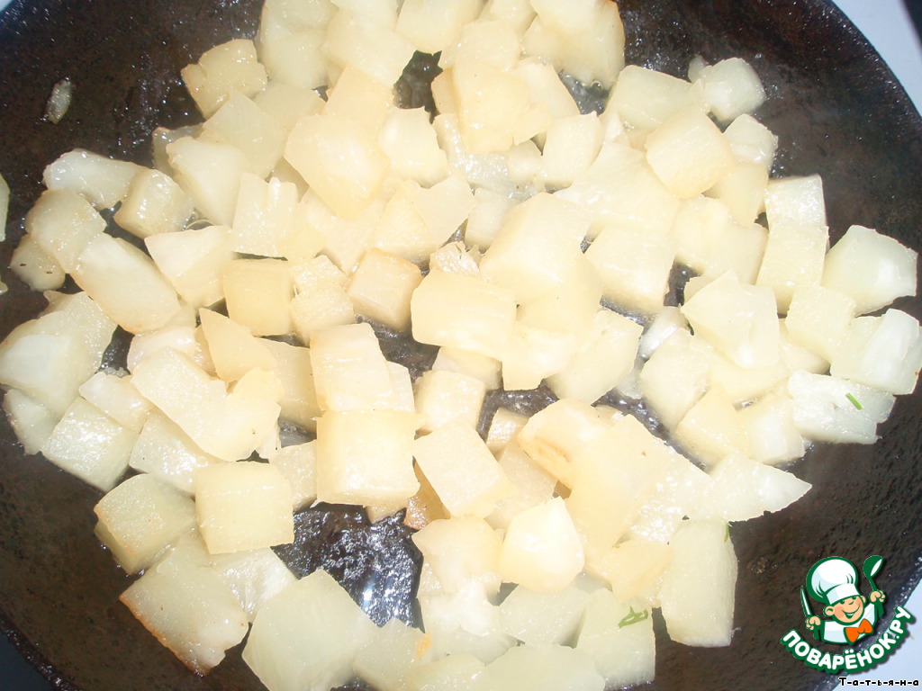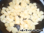Нарезать ананасы кубиками, поджарить на сковороде на сливочном масле. |
