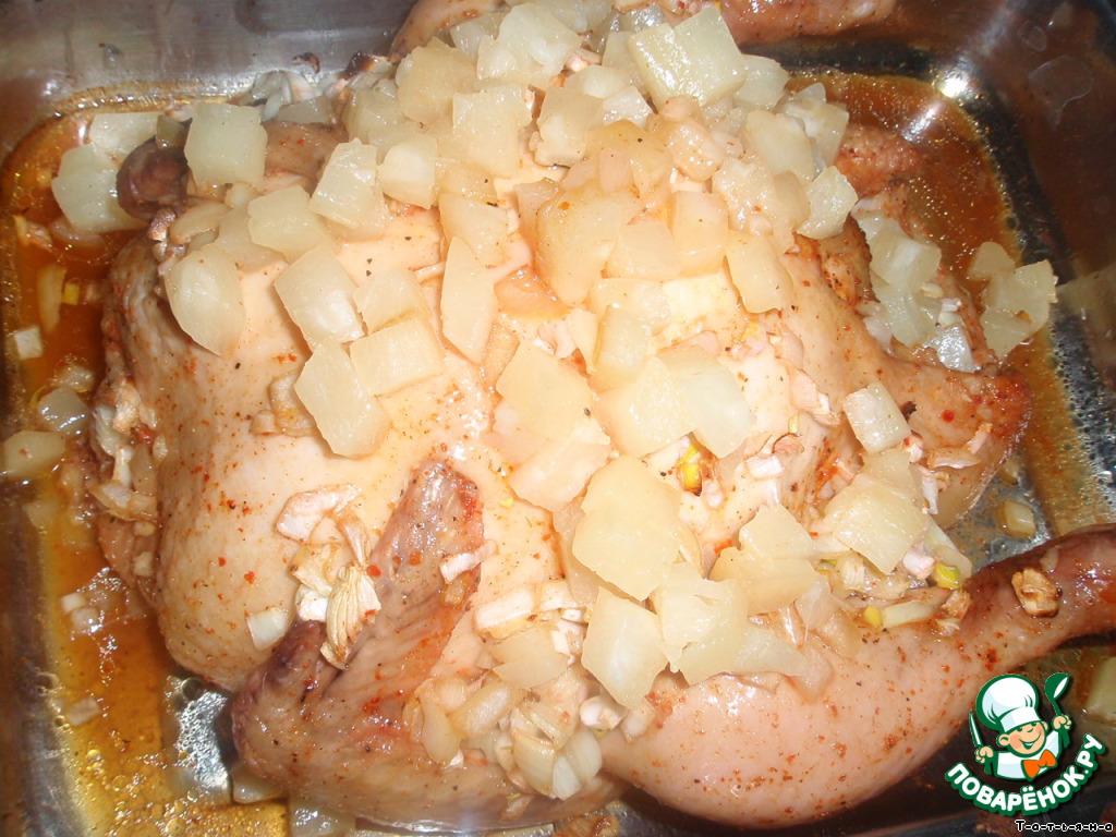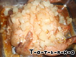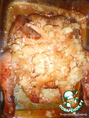 После этого полить смесью лимонного и ананасового сока (из банки) и готовить еще 30 минут, время от времени поливая соком. |