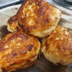 Крабовые палочки пропустить через мясорубку, соединить с куриным фаршем, добавить белый хлеб, предварительно размоченный в воде, соль, перец, измельченный лук, взбитые яйца.