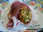 Мясо посолить, посыпать черным перцем и приправами. Кусочек мяса развернуть как книжку, наполнить овощной смесью.