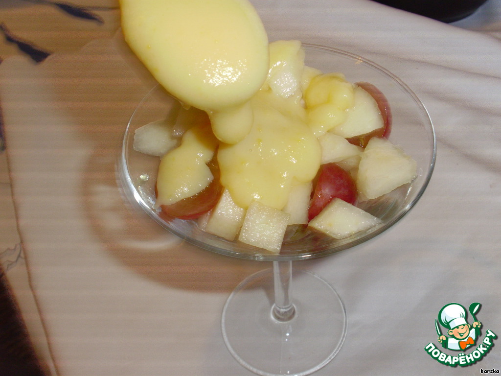 Можно использовать как крем для фруктового салата. Я нарезала кубиками грушу, сбрызнула лимонным соком, добавила нарезанный виноград.