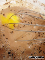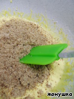 В желтки добавляем измельченные орехи, муку с разрыхлителем и половину белков. Аккуратно все соединяем, по рецепту, автор добавляет маргарин, но у меня был печальный опыт с масляным бисквитом и я не решилась. Добавляем остальные белки и выкладываем тесто в форму. Выпекаем 40-45 минут при температуре 180-200гр.