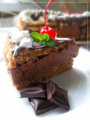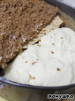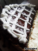 На вторую половину коржа выкладываем шоколадный крем, таким образом у нас получается торт состоящий из двух разных половинок с разным кремом.
