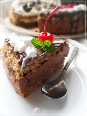 Украшаем взбитыми сливками и десертной вишней. Половинки ореха покрываем шоколадом и тоже украшаем ими белую часть торта.
