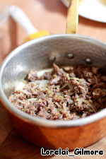 Ну а когда голяшка была готова, разобрала ее на волокна и еще раз прогрела с луком, добавила порошкового острого чили, еще раз перемешала.