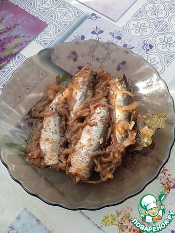 Затем еще слой рыбки, оставшийся лук и лавровый лист. Заливаем заливкой. На рыбу кладем тарелку, чтобы прижать к сковороде и не давать ей "прыгать" во время готовки. Накрываем крышкой, ставим на маленький огонь ровно на один час.