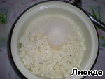 Творог растереть с сахаром блендером.