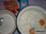 Теперь добавьте в творог яичные желтки, ванильный сахар, разрыхлитель, манку со сливками. Размешайте тщательно ложкой.