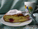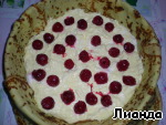 Выложить половину начинки в форму. Сверху распределите вишню. У меня была замороженная без косточек. Накройте начинку сверху блином.