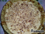 На блин положите вторую половину начинки и посыпьте измельченными орехами. Я брала фундук. Мелко не измельчайте.