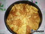 Закройте начинку свисающими краями блинов. Выпекайте 40 мин. при температуре 180*. За 15 мин. до окончания выпечки накройте пирог бумагой.