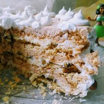 Пока коржи подпекаются, взбиваем белки с сахаром, солью и ванилином. Коржи достаем, покрываем белками и печем при 150 градусах, пока безе не зарумянится.