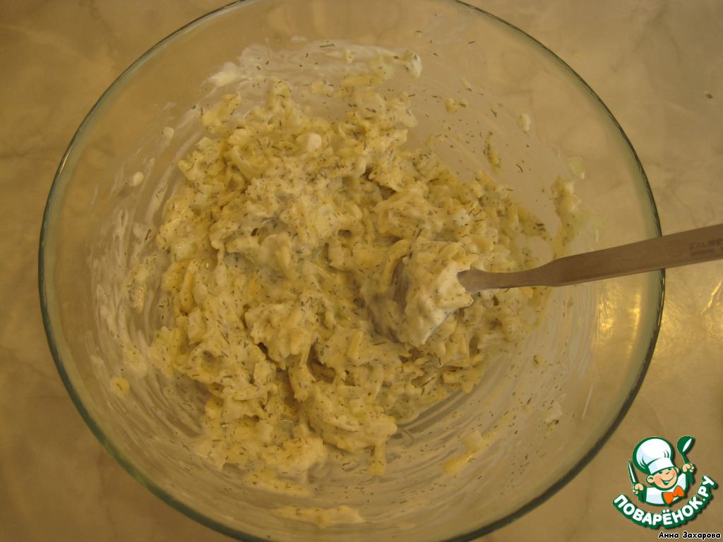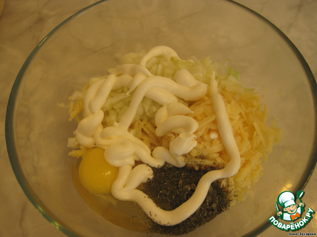 Готовим начинку: натрем сыр, добавим яйцо, лук, зелень (я взяла сушеный укроп), майонез.