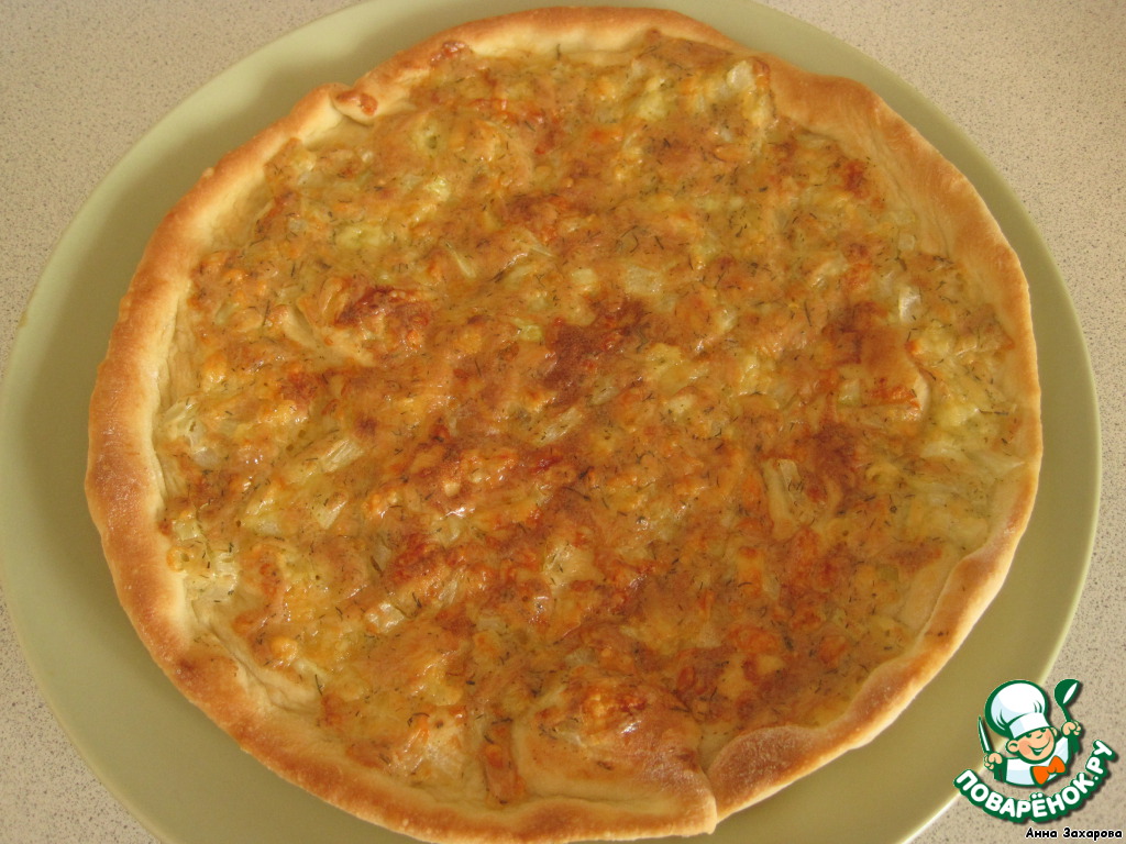 Раскатываем тесто толщиной 0,5-1 см (кто как любит), смазываем противень или форму растительным маслом, выкладываем тесто, сверху - начинку.