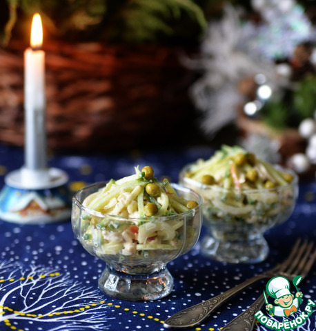 3. Куриную грудку нарезать по возможности соломкой. Яблоко вымыть, сердцевину удалить и тоже нарезать соломкой.