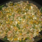 Креветки (варено-мороженые) заливаем кипятком, остужаем, воду сливаем.