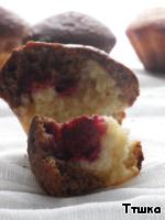 В смазанную маслом форму положить по ложке теста, а сверху по одной малинке