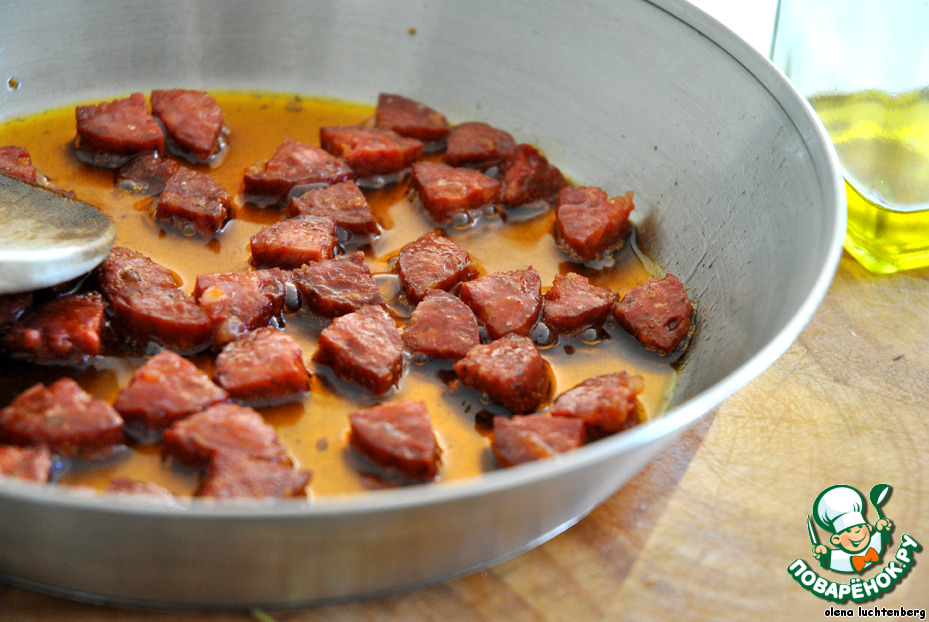 Чоризо - испанская пикантная колбаса с большим количеством паприки. Колбасу нарезать небольшими кусочками и поджарить на сухой сковороде. Чоризо довольно жирный, на фото видно, сколько жира выделилось. Я обычно сливаю большую часть, оставляя примерно столовую ложку в сковороде. Но если лишний жир - не проблема, то оставляйте весь, от этого блюдо только выиграет во вкусе.