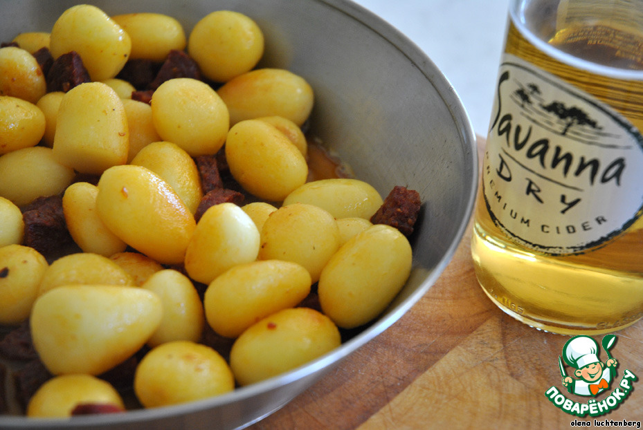 К поджаренному чоризо добавить охлажденный отварной картофель, нарезанный кусочками, слегка поджарить. Влить сидр.