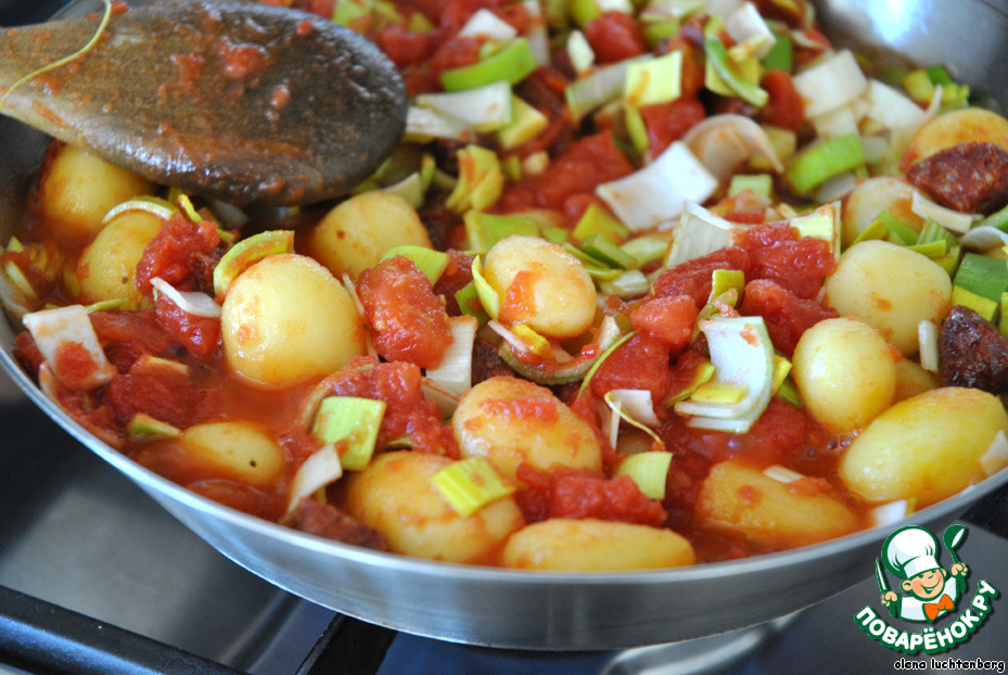 Добавить томаты кусочками в собственном соку (летом лучше, конечно, свежие помидоры без кожицы) и измельченный и вымытый лук-порей. Накрыть крышкой и тушить 10 минут. Проверьте соус на вкус и добавьте по надобности соль и перец. Я обычно не добавляю.