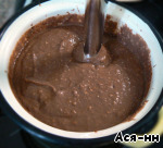 Взять 400 мл кокосового молока (или соевого молока, или воды), поставить на огонь, добавить мелко дробленный миндаль, довести до кипения. Выключить огонь, всыпать какао, ванильный сахар, добавить масло и бананы, все пробить блендером (попробуйте на сахар, если покажется не сладким, добавьте его по вкусу). Я брала соевое молоко и масса после взбивания сразу стала густой. Если покажется жидковатой, можно добавить немного муки для густоты.