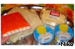Ингредиенты для рулета. Три лаваша. Две баночки мягкого сыра. Тёртый сыр. Крабовые палочки.