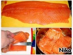 Лосось разрезала и посолила. Убрала в холодильник на 6 часов. Затем разрезала рыбу вдоль.