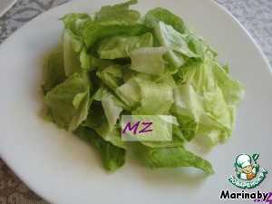 Листья салата порвать руками и выложить порционно горкой на тарелку.