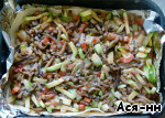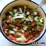 Баклажаны предварительно вымочить в соленой воде в течении 30 мин., чтобы ушла горечь. Затем отжать, к баклажанам добавить порезанные кабачок и помидоры.