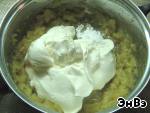 В яблочное пюре выкладываем сметану (сметана должна быть жирной, у меня 25% жирности), добавляем пакетик ванильного сахара.