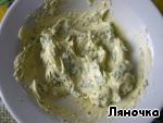 Готовим начинку: смешиваем в чашке размягченное сливочное масло (если масло из холодильника, то просто подогрейте его секунд 10-15 в микроволновке, оно станет мягким), измельченный чеснок и зелень.