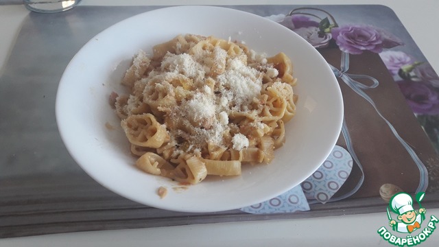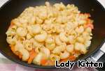 Добавить пасту, залить рыбным бульоном и тушим на 2-3 минуты дольше, чем указано на упаковке к пасте. У меня было указано 10 минут, я тушила 13.