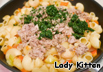 Из банки с тунцом слить масло. Кусочки рыбы добавить в сковороду к пасте. Посыпать рубленной петрушкой и перемешать.