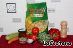 Наши продукты: макароны (гнезда), помидоры, цуккини, морковь, сладкий перец, лук красный, фасоль зеленая, соус "Песто Россо" и оливковое масло.
