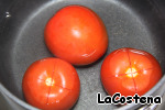Помидоры надрежем крестообразно и поместим в горячую воду, чтобы снять с них кожицу.