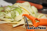 При помощи овощечистки нарежем цуккини длинными, тонкими полосками.