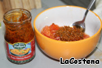 Помидоры мелко рубим, выкладываем в пиалу и добавляем большую ложку соуса "Песто Россо". Этот соус сделан на основе базилика, так же, как и классический "Песто", но в него добавлены высушенные на солнце томаты, поэтому вкус блюда становится более насыщенным.