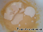 Положить размягченный маргарин, и, продолжая растирать, добавить сметану.