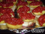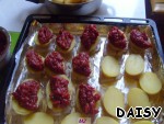 На половинки картофеля намазываем заправку, мы любим погуще (это на ваш вкус).