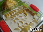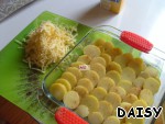 Режем кружочками каротофель и укладываем в форму, смазанную оливковым маслом. Посыпем солью, мускатным орехом и перцем по вкусу. Сыр трем на крупной терке.