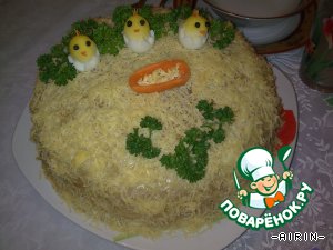 Я не нашла таких цыплят на сайте, поэтому решила поделиться идеей украшения салата. Это старый рецепт, но из перепелиных яиц он смотрится гораздо лучше.